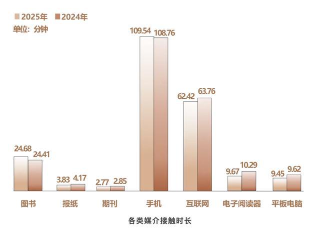 同时,数据显示,在数字化媒介中,2025 年我国成年国民人均每天手机接触时长为 109.54 分钟,相比 2024 年增加 0.78 分钟,手机使用黏性进一步增强。人均每天通过电脑端网络在线阅读时长为 62.42 分钟,人均每天电子阅读器阅读时长为 9.67 分钟,人均每天 Pad(平板电脑)阅读时长为 9.45 分钟,均较 2024 年有不同程度的缩减。