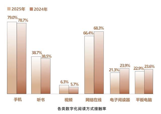 从阅读载体来看,成年国民的手机阅读率持续稳定在高位,2025 年我国成年国民的手机阅读率为 79.0%,较 2024 年的 78.7% 增长了 0.3%。除手机阅读外,听书及视频讲书也是成年国民主要的数字化阅读方式。其中听书比例由 38.5% 提升至 38.7%,视频讲书从 5.7% 增至 6.3%,数字阅读形态愈发多元。