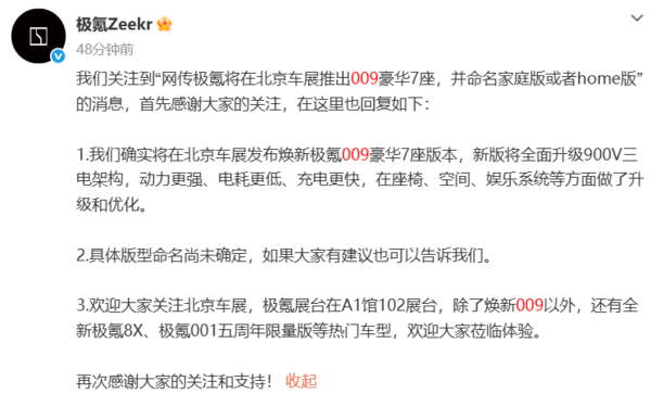 【CNMO科技消息】4月21日,针对近期网传“极氪将在北京车展推出009豪华7座家庭版”的消息,极氪官方正式作出回应。极氪确认,将在2026北京国际汽车展览会上发布焕新极氪009豪华7座版本,新车将全面升级900V三电架构,动力更强、电耗更低、充电更快,同时在座椅、空间、娱乐系统等方面进行升级和优化。至于具体版型命名,官方表示尚未确定,并邀请用户提出建议。
